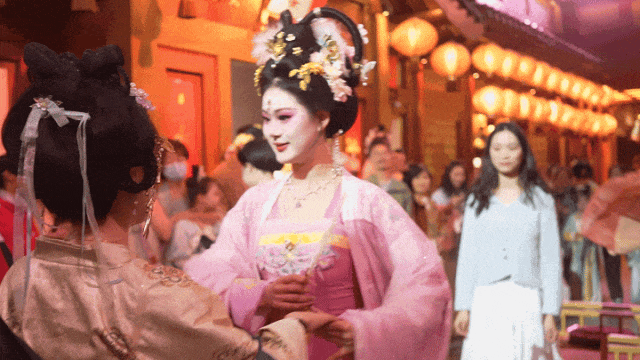 “大演艺+小互动”全天百余场精彩不停歇,《霓裳羽衣舞》《万邦来朝》《花魁大赏》《差不多大人》……舞台延伸至街巷,游客受邀同台互动,从旁观者变身剧中人,戏里戏外皆是盛唐意趣。