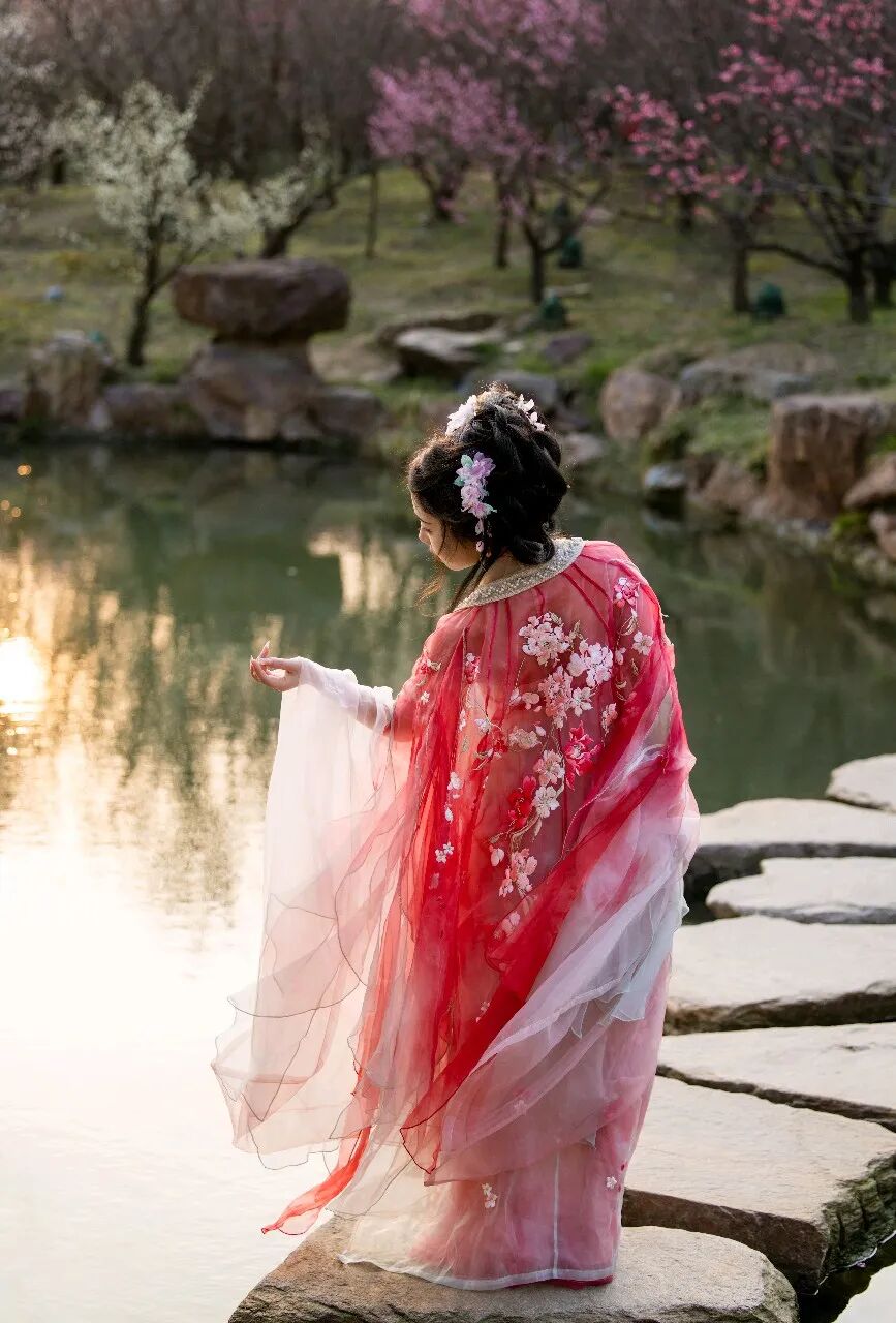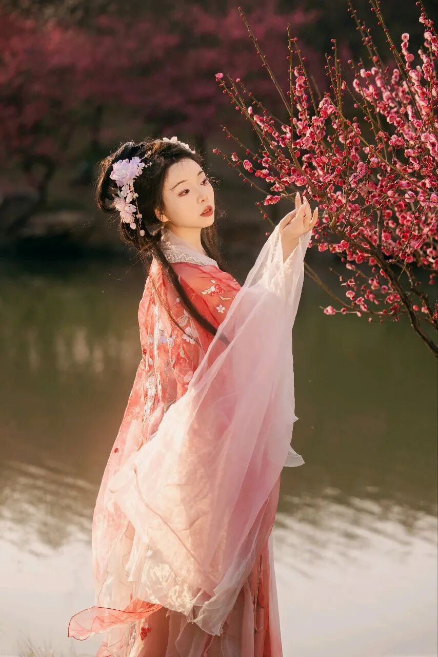 临水俯首而立,脚下是漾着细纹的浅浅清波。指尖轻轻抬起,似要接住随风飘落的飞花,姿态轻柔又自然。低头的瞬间,眉眼满是温柔,红衫的倒影静静落在水里,与梅影相融相依,波光粼粼间,画面柔得不像话。水面的光影为这张照片添了几分朦胧的美感,不用过多的修饰,只是简单一个俯首的动作,便把江南的温婉与柔情,展现得淋漓尽致。