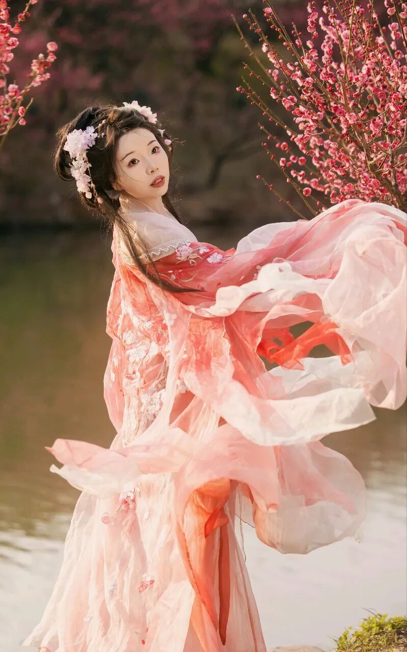 转身回眸的瞬间,恰好有风轻轻拂过,纱袂顺势随风轻扬,漾出一抹灵动的弧度。没有刻意的微笑,眉眼间带着淡淡的清柔,目光轻抬,不疾不徐,自有一份从容。红衫的艳与梅枝的影在身后交织错落,动态的衣袂与静态的花枝相互映衬,一动一静间,便把春日里的鲜活与美好,都定格在这一个回眸里,让人一眼便记在心底。