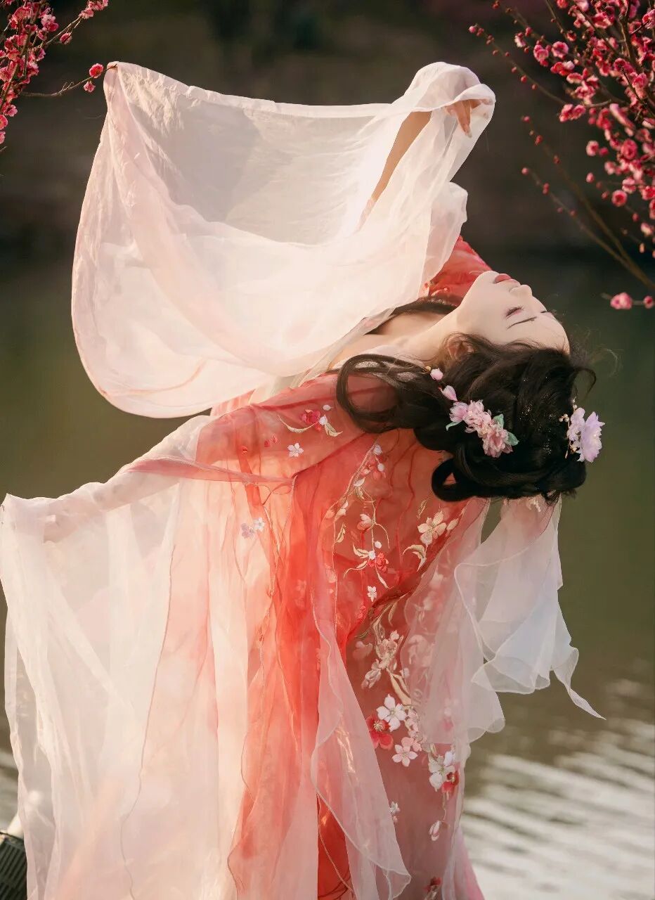 仰头轻倚在梅枝旁,身体全然放松,没有半分僵硬的姿态,纱幔自然漫过肩头,垂落出柔和的线条。轻轻闭上眼睛,似在静听风拂过花枝的轻响,又似在慢慢感受早春的清浅气息,整个人都沉浸在这份独有的静谧里。阳光柔柔洒下,落在发梢与衣袂间,衬得红衫更显温润,梅枝的影轻轻落在身上,像给画面晕染了一层温柔的滤镜,似醉在这抹江南春红里。