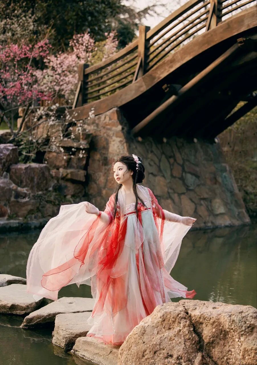 石桥踏水而立,脚下是古朴的石墩,身旁是漾着微波的春水。双臂轻轻展开,并非刻意的张开,只是自然舒展,衣袂顺势拂过清波,带起细碎的涟漪。目光望向远方,眉眼间带着淡淡的清逸,一袭红衫在春水与梅枝的映衬下,更显灵动婉约。这一刻,人与景浑然相融,风与水温柔相伴,满是江南的清逸与诗意,仿佛整个人都融进了这帧早春的画卷里。