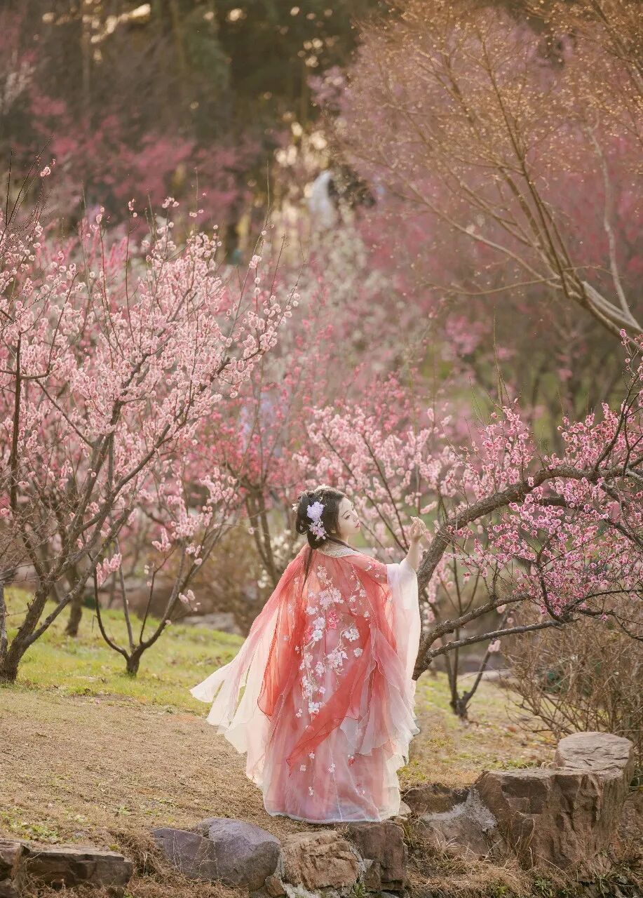 轻倚在石径旁的梅枝边,手轻轻抚在梅枝上。动作温柔舒缓,身姿微微侧立,没有刻意的挺胸抬头,只是最自然的姿态,便藏着淡淡的雅致。红衫的暖艳与石径的古朴、梅枝的红影相互映衬,画面和谐又温润,将早春的淡淡余韵,悄悄藏进这一方画面里,每一眼望去,都有不一样的温柔意趣。