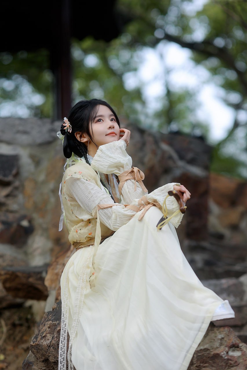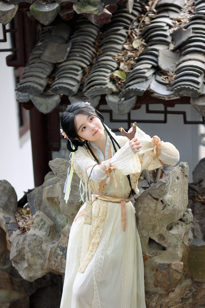 假山叠翠,古意盎然。衣袂飘飘,似要乘风而去。