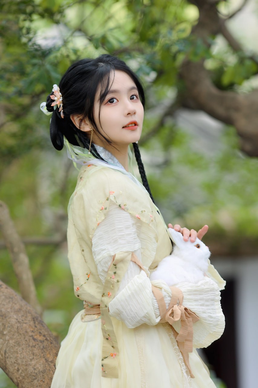 白兔为伴,绿枝为邻。浅笑嫣然,恍若月中仙子。