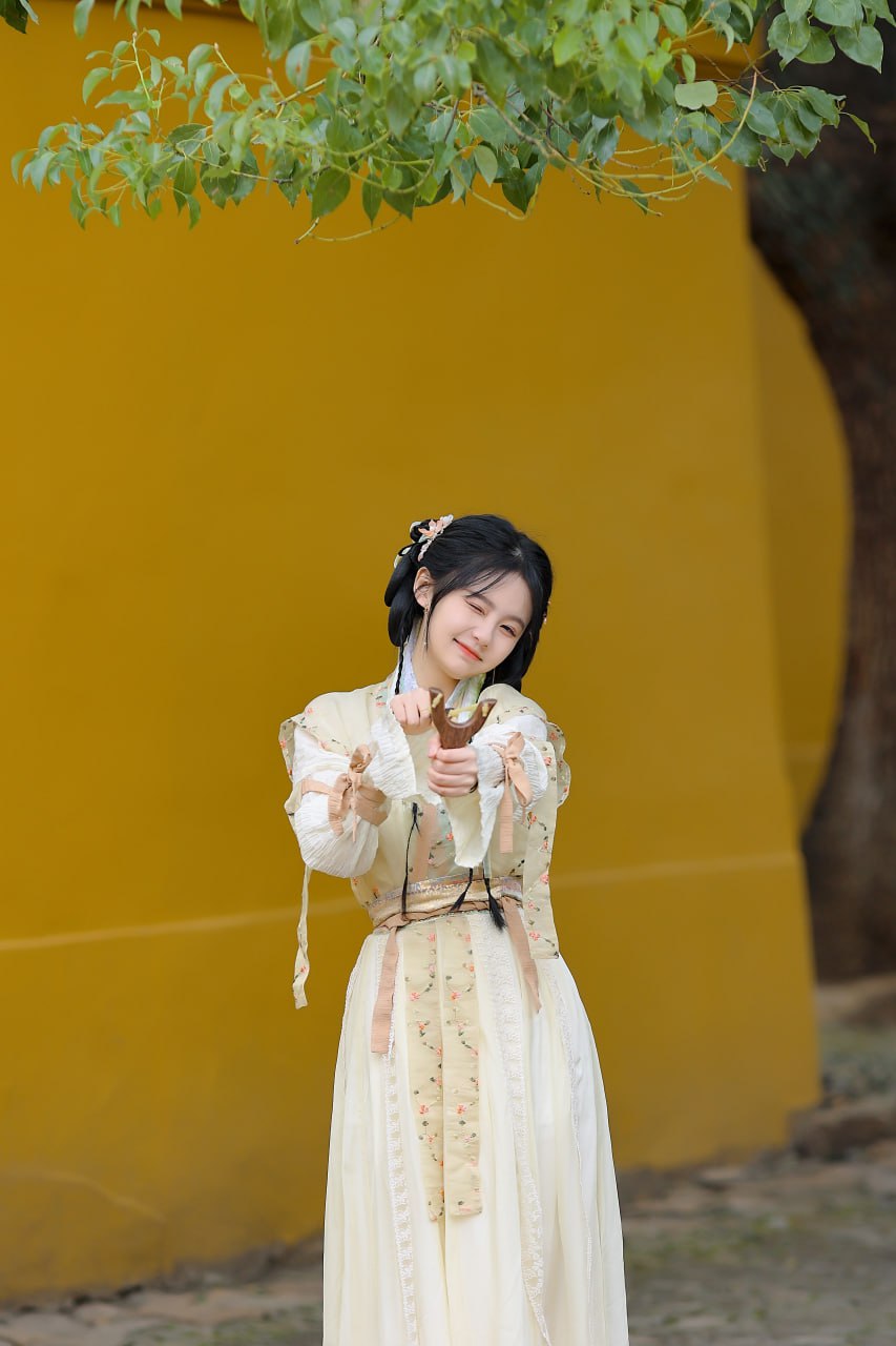 黄墙之下,绿叶垂荫。弓开如满月,笑靥藏锋芒。