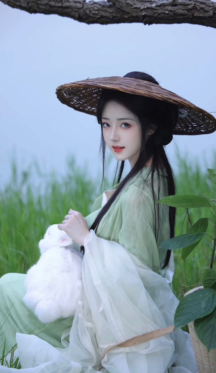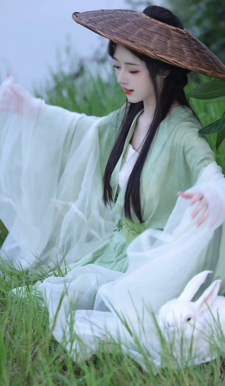 翠色罗衣映草色,云鬓轻绾系春风。竹笠半掩芙蓉面,素手纤纤采露浓。玉兔偎裙聆细语,藤篮盛满碧玲珑。恍见林间仙子影,一颦一笑醉青穹。