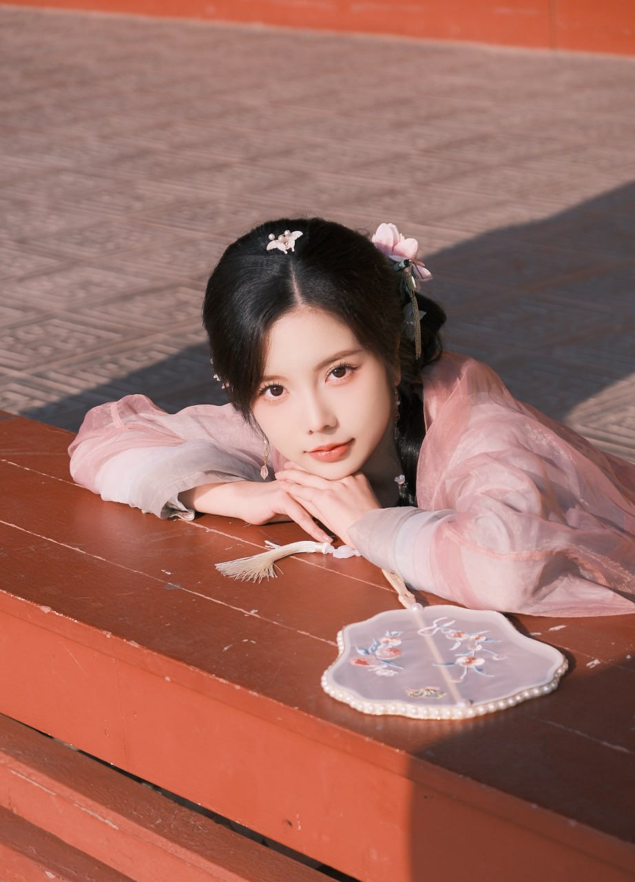暖光洒落雕花廊,粉裳如云铺展,珍珠耳坠随呼吸轻颤,恰似时光在此刻停驻