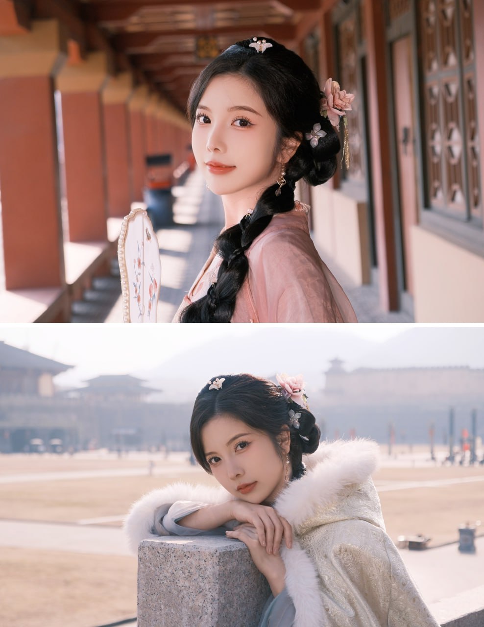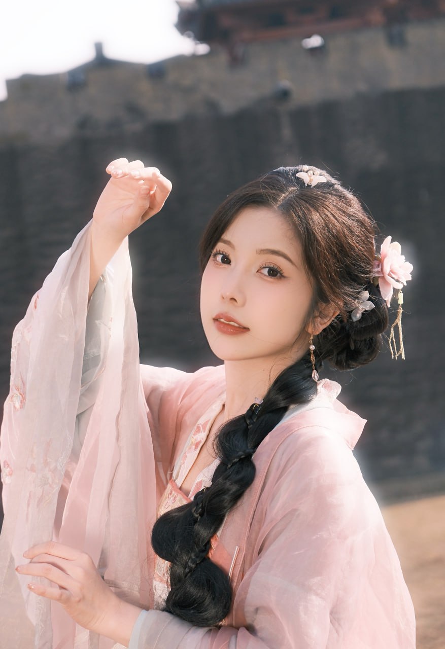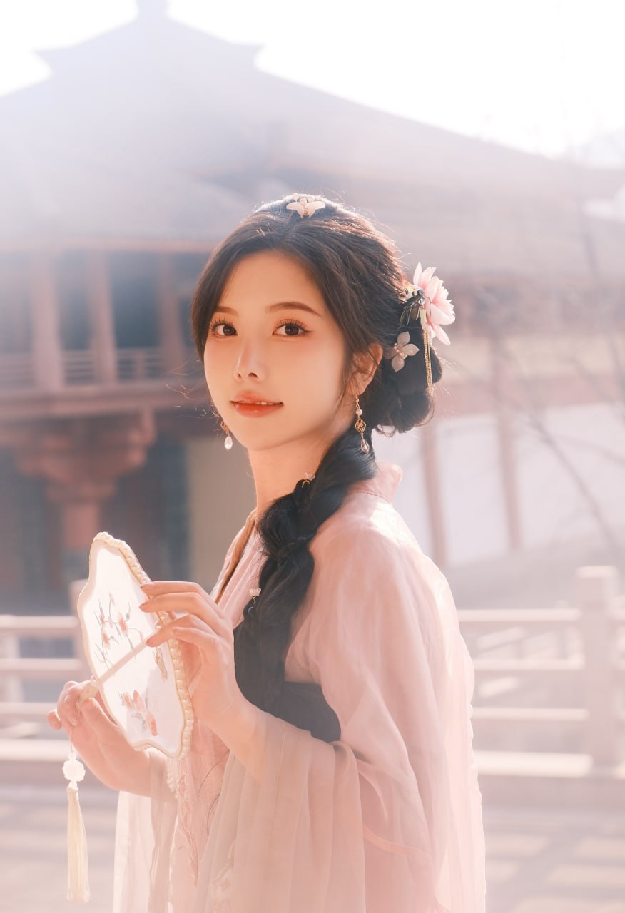 麻花辫垂落肩头,发间繁花与古建筑相映成趣,广袖轻拢处,惊起一帘幽梦
