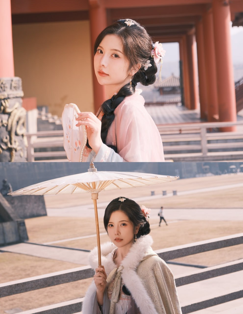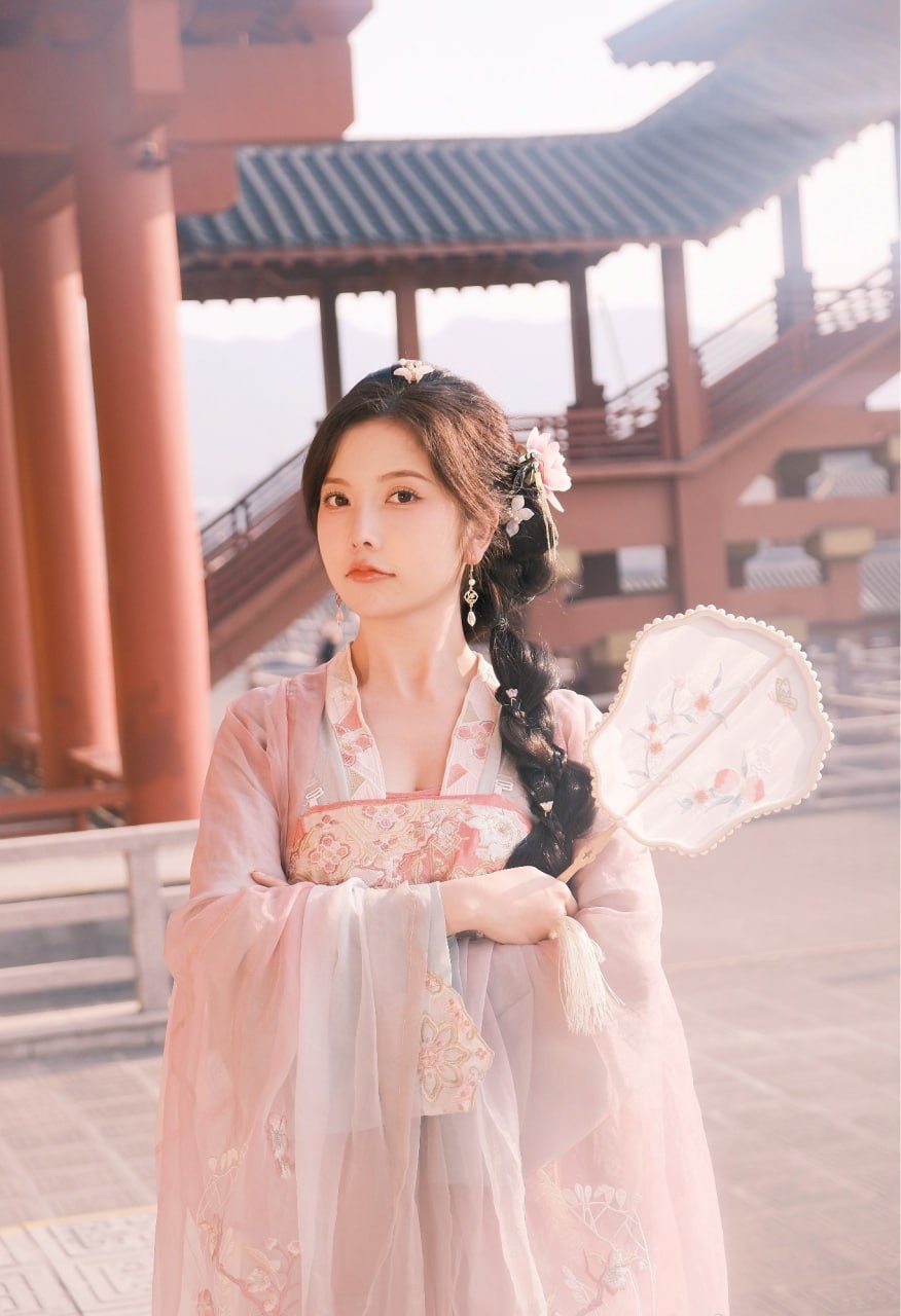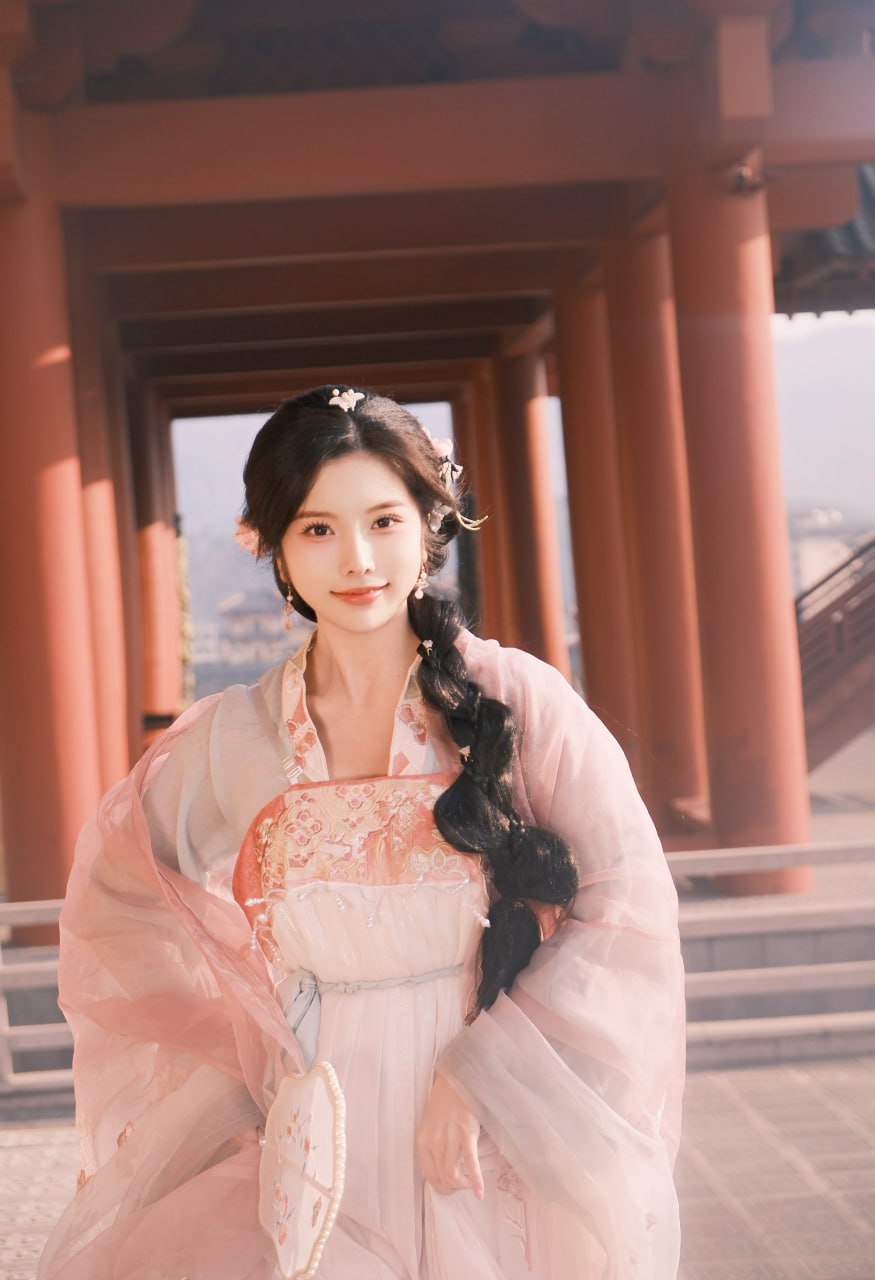 麻花辫垂落肩头,发间繁花与古建筑相映成趣,广袖轻拢处,惊起一帘幽梦