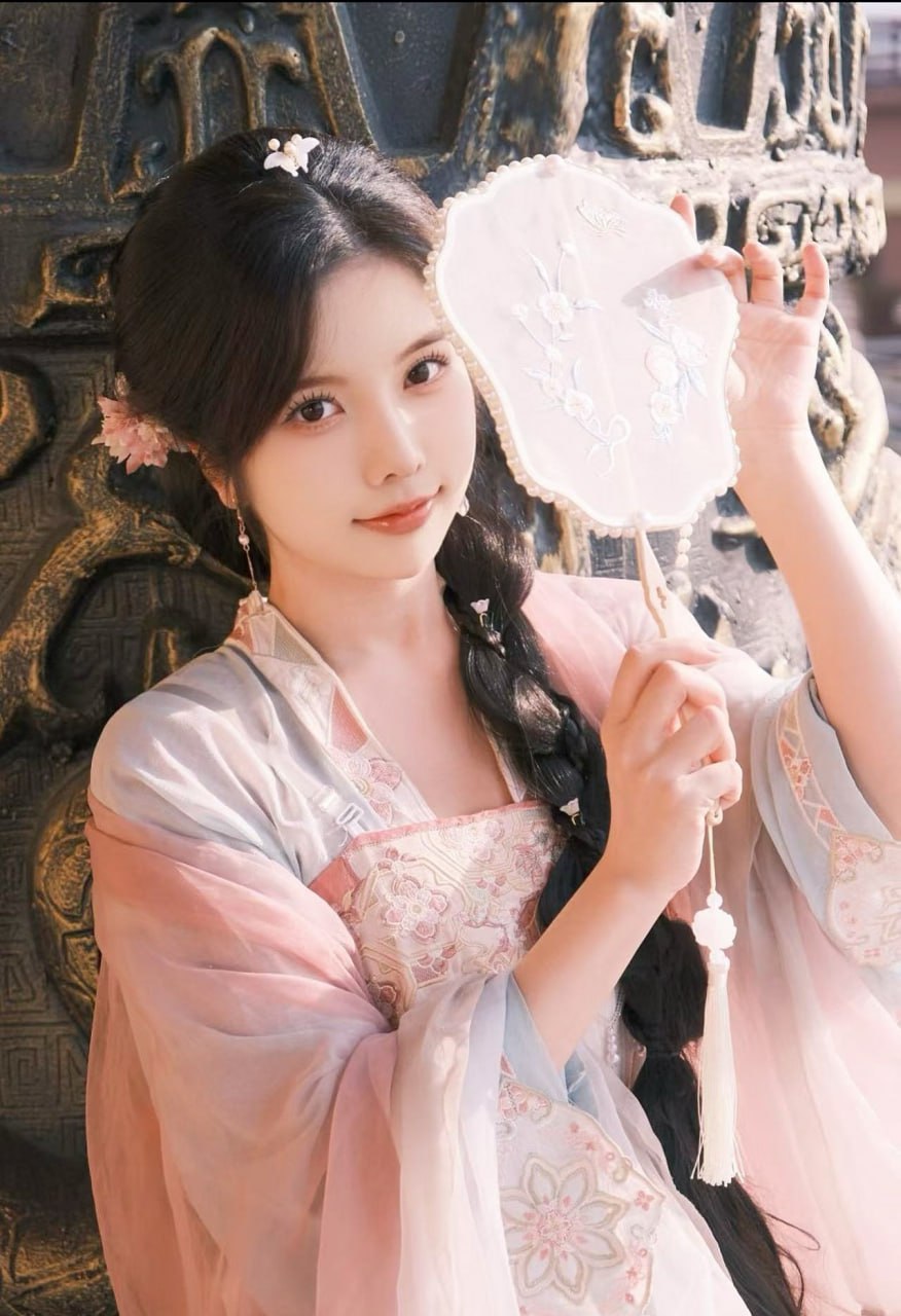 阳光穿过檐角织就金线,粉衣女子执扇而立,恰似工笔画中走出的唐人仕女