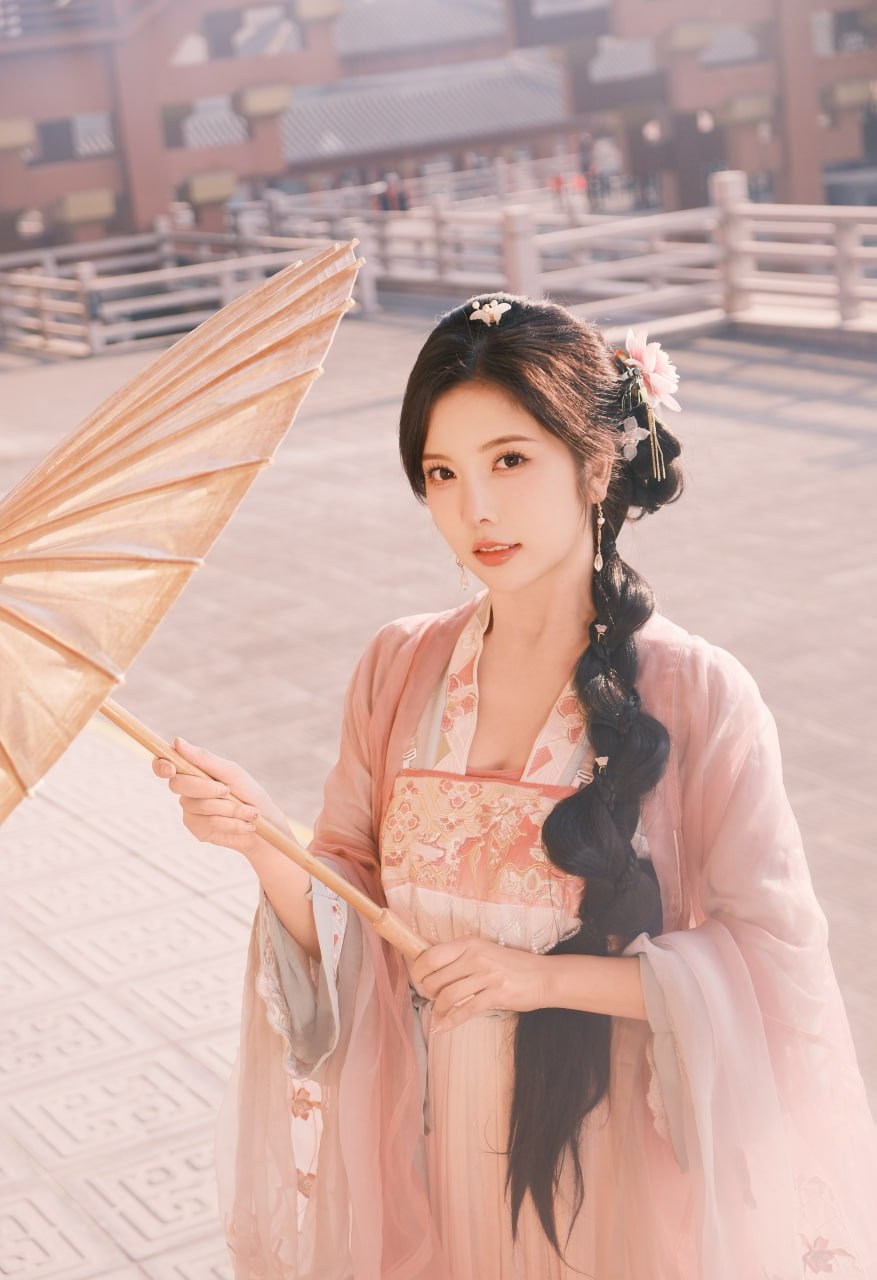 浅黄纸伞撑开旧时光,发髻璎珞交相辉映,红墙灰瓦前,裙摆翻涌如三月桃花汛